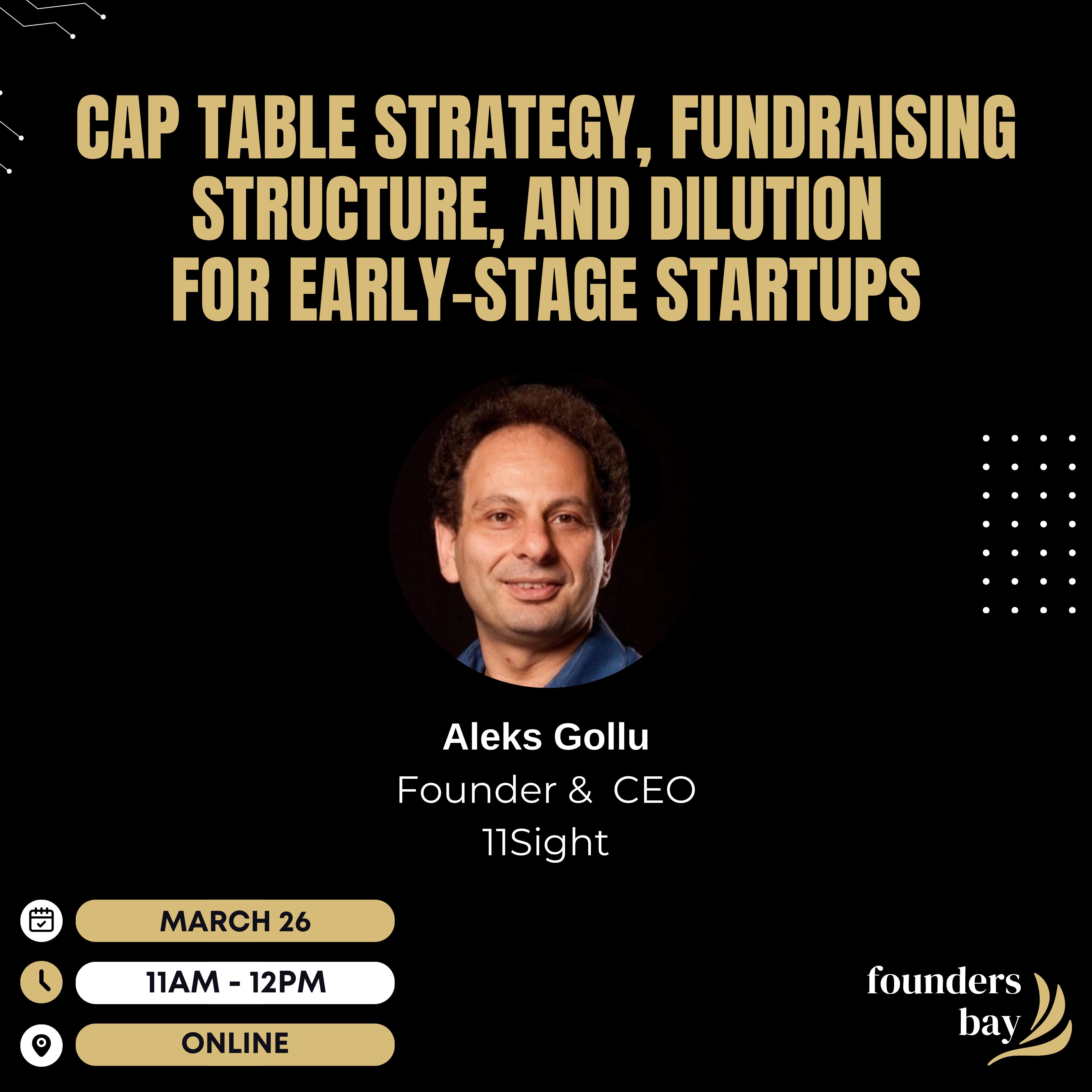 Building a startup is not just about product and growth—it’s about making smart ownership decisions early. In this interactive virtual workshop, Aleks Gollu, Founder & CEO of 11Sight, will break down how early-stage founders can design a healthy cap table, structure fundraising rounds, and avoid unnecessary dilution as they scale.
